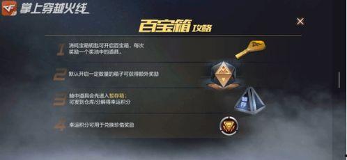 值得一提的是,CF手游的百宝箱不仅丰富了游戏内容,还让玩家们感受到了游戏的乐趣。在这个充满挑战与机遇的世界里,百宝箱成为了玩家们追求梦想的象征。